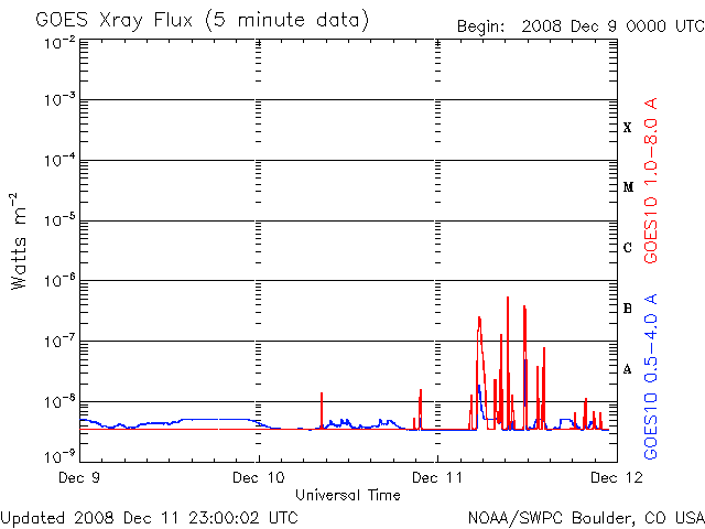 Die Daten in der obigen Grafik wurden geändert, um den Skalierungsfaktor des Space Weather Prediction Center (SWPC) zu entfernen. Durch den SWPC-Skalierungsfaktors für die Flare-Indizes werden die operativen Daten um 42 % kleiner angegeben als für die wissenschaftlichen Qualitätsdaten. Der Skalierungsfaktor wurde auch aus der Liste der Sonneneruptionen entfernt, um die tatsächlichen physikalischen Einheiten wiederzugeben.