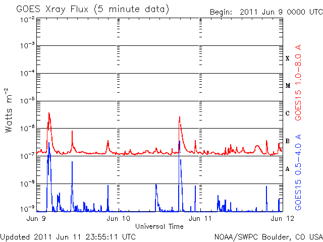 Die Daten in der obigen Grafik wurden geändert, um den Skalierungsfaktor des Space Weather Prediction Center (SWPC) zu entfernen. Durch den SWPC-Skalierungsfaktors für die Flare-Indizes werden die operativen Daten um 42 % kleiner angegeben als für die wissenschaftlichen Qualitätsdaten. Der Skalierungsfaktor wurde auch aus der Liste der Sonneneruptionen entfernt, um die tatsächlichen physikalischen Einheiten wiederzugeben.