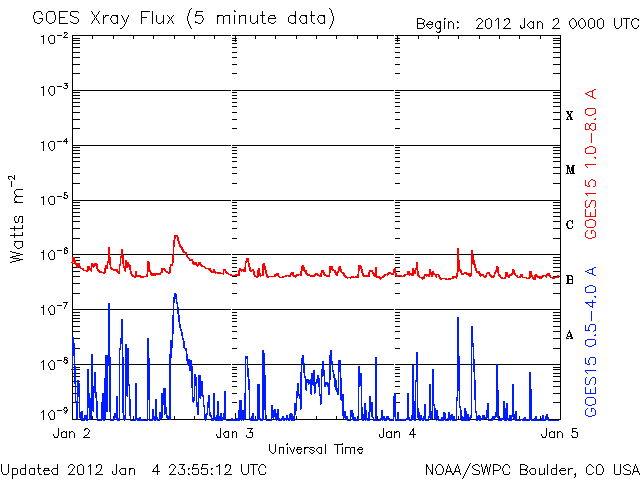 Die Daten in der obigen Grafik wurden geändert, um den Skalierungsfaktor des Space Weather Prediction Center (SWPC) zu entfernen. Durch den SWPC-Skalierungsfaktors für die Flare-Indizes werden die operativen Daten um 42 % kleiner angegeben als für die wissenschaftlichen Qualitätsdaten. Der Skalierungsfaktor wurde auch aus der Liste der Sonneneruptionen entfernt, um die tatsächlichen physikalischen Einheiten wiederzugeben.