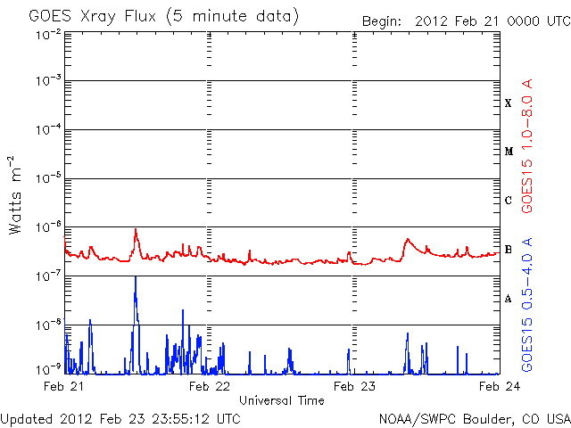 Die Daten in der obigen Grafik wurden geändert, um den Skalierungsfaktor des Space Weather Prediction Center (SWPC) zu entfernen. Durch den SWPC-Skalierungsfaktors für die Flare-Indizes werden die operativen Daten um 42 % kleiner angegeben als für die wissenschaftlichen Qualitätsdaten. Der Skalierungsfaktor wurde auch aus der Liste der Sonneneruptionen entfernt, um die tatsächlichen physikalischen Einheiten wiederzugeben.