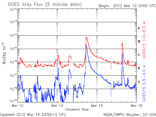 Die Daten in der obigen Grafik wurden geändert, um den Skalierungsfaktor des Space Weather Prediction Center (SWPC) zu entfernen. Durch den SWPC-Skalierungsfaktors für die Flare-Indizes werden die operativen Daten um 42 % kleiner angegeben als für die wissenschaftlichen Qualitätsdaten. Der Skalierungsfaktor wurde auch aus der Liste der Sonneneruptionen entfernt, um die tatsächlichen physikalischen Einheiten wiederzugeben.