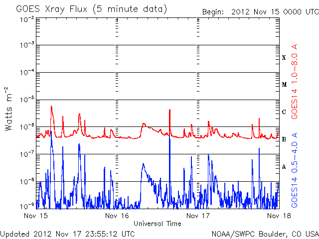 Die Daten in der obigen Grafik wurden geändert, um den Skalierungsfaktor des Space Weather Prediction Center (SWPC) zu entfernen. Durch den SWPC-Skalierungsfaktors für die Flare-Indizes werden die operativen Daten um 42 % kleiner angegeben als für die wissenschaftlichen Qualitätsdaten. Der Skalierungsfaktor wurde auch aus der Liste der Sonneneruptionen entfernt, um die tatsächlichen physikalischen Einheiten wiederzugeben.