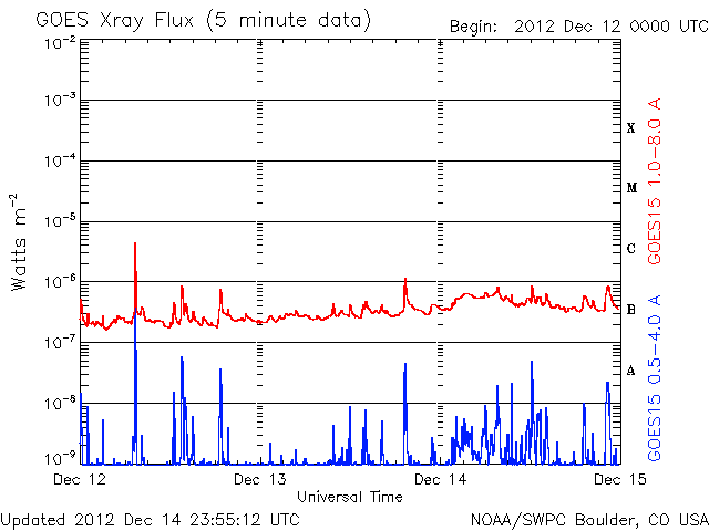 Die Daten in der obigen Grafik wurden geändert, um den Skalierungsfaktor des Space Weather Prediction Center (SWPC) zu entfernen. Durch den SWPC-Skalierungsfaktors für die Flare-Indizes werden die operativen Daten um 42 % kleiner angegeben als für die wissenschaftlichen Qualitätsdaten. Der Skalierungsfaktor wurde auch aus der Liste der Sonneneruptionen entfernt, um die tatsächlichen physikalischen Einheiten wiederzugeben.