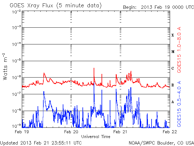 Die Daten in der obigen Grafik wurden geändert, um den Skalierungsfaktor des Space Weather Prediction Center (SWPC) zu entfernen. Durch den SWPC-Skalierungsfaktors für die Flare-Indizes werden die operativen Daten um 42 % kleiner angegeben als für die wissenschaftlichen Qualitätsdaten. Der Skalierungsfaktor wurde auch aus der Liste der Sonneneruptionen entfernt, um die tatsächlichen physikalischen Einheiten wiederzugeben.