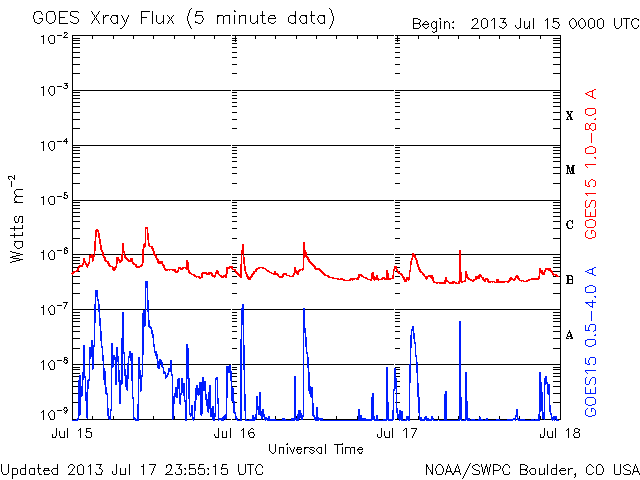 Die Daten in der obigen Grafik wurden geändert, um den Skalierungsfaktor des Space Weather Prediction Center (SWPC) zu entfernen. Durch den SWPC-Skalierungsfaktors für die Flare-Indizes werden die operativen Daten um 42 % kleiner angegeben als für die wissenschaftlichen Qualitätsdaten. Der Skalierungsfaktor wurde auch aus der Liste der Sonneneruptionen entfernt, um die tatsächlichen physikalischen Einheiten wiederzugeben.