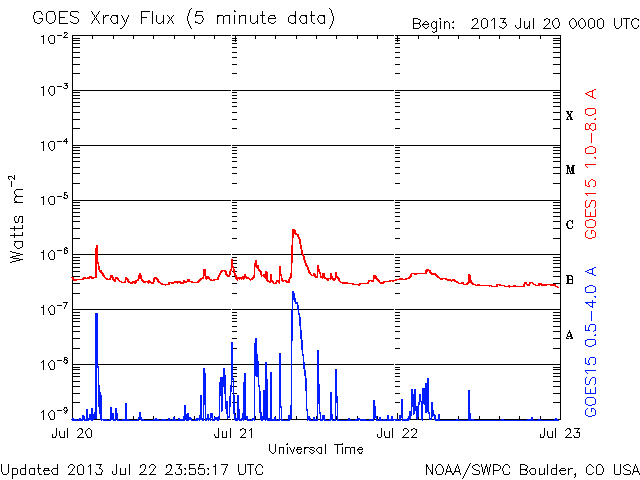 Die Daten in der obigen Grafik wurden geändert, um den Skalierungsfaktor des Space Weather Prediction Center (SWPC) zu entfernen. Durch den SWPC-Skalierungsfaktors für die Flare-Indizes werden die operativen Daten um 42 % kleiner angegeben als für die wissenschaftlichen Qualitätsdaten. Der Skalierungsfaktor wurde auch aus der Liste der Sonneneruptionen entfernt, um die tatsächlichen physikalischen Einheiten wiederzugeben.