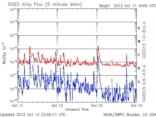 Die Daten in der obigen Grafik wurden geändert, um den Skalierungsfaktor des Space Weather Prediction Center (SWPC) zu entfernen. Durch den SWPC-Skalierungsfaktors für die Flare-Indizes werden die operativen Daten um 42 % kleiner angegeben als für die wissenschaftlichen Qualitätsdaten. Der Skalierungsfaktor wurde auch aus der Liste der Sonneneruptionen entfernt, um die tatsächlichen physikalischen Einheiten wiederzugeben.