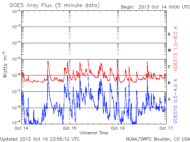 Die Daten in der obigen Grafik wurden geändert, um den Skalierungsfaktor des Space Weather Prediction Center (SWPC) zu entfernen. Durch den SWPC-Skalierungsfaktors für die Flare-Indizes werden die operativen Daten um 42 % kleiner angegeben als für die wissenschaftlichen Qualitätsdaten. Der Skalierungsfaktor wurde auch aus der Liste der Sonneneruptionen entfernt, um die tatsächlichen physikalischen Einheiten wiederzugeben.