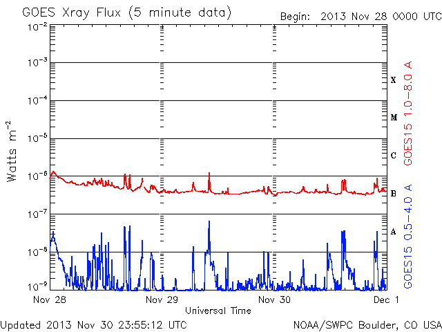 Die Daten in der obigen Grafik wurden geändert, um den Skalierungsfaktor des Space Weather Prediction Center (SWPC) zu entfernen. Durch den SWPC-Skalierungsfaktors für die Flare-Indizes werden die operativen Daten um 42 % kleiner angegeben als für die wissenschaftlichen Qualitätsdaten. Der Skalierungsfaktor wurde auch aus der Liste der Sonneneruptionen entfernt, um die tatsächlichen physikalischen Einheiten wiederzugeben.