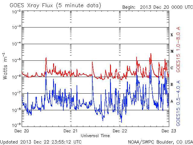 Die Daten in der obigen Grafik wurden geändert, um den Skalierungsfaktor des Space Weather Prediction Center (SWPC) zu entfernen. Durch den SWPC-Skalierungsfaktors für die Flare-Indizes werden die operativen Daten um 42 % kleiner angegeben als für die wissenschaftlichen Qualitätsdaten. Der Skalierungsfaktor wurde auch aus der Liste der Sonneneruptionen entfernt, um die tatsächlichen physikalischen Einheiten wiederzugeben.
