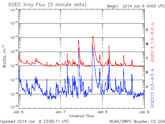 Die Daten in der obigen Grafik wurden geändert, um den Skalierungsfaktor des Space Weather Prediction Center (SWPC) zu entfernen. Durch den SWPC-Skalierungsfaktors für die Flare-Indizes werden die operativen Daten um 42 % kleiner angegeben als für die wissenschaftlichen Qualitätsdaten. Der Skalierungsfaktor wurde auch aus der Liste der Sonneneruptionen entfernt, um die tatsächlichen physikalischen Einheiten wiederzugeben.