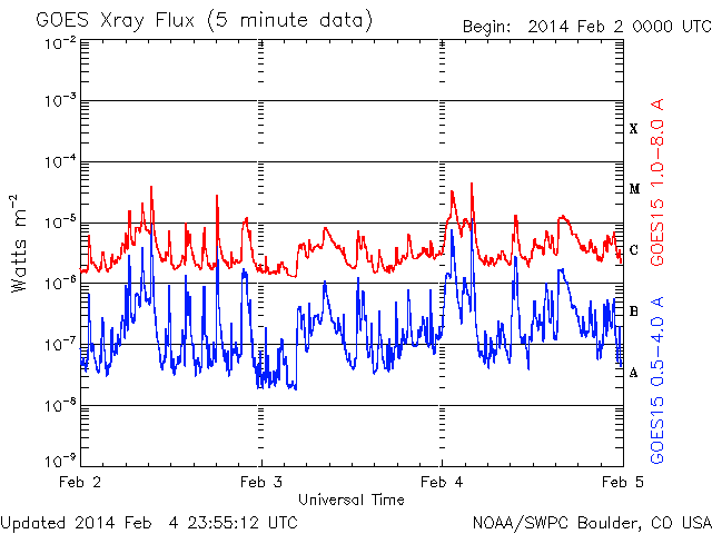 Die Daten in der obigen Grafik wurden geändert, um den Skalierungsfaktor des Space Weather Prediction Center (SWPC) zu entfernen. Durch den SWPC-Skalierungsfaktors für die Flare-Indizes werden die operativen Daten um 42 % kleiner angegeben als für die wissenschaftlichen Qualitätsdaten. Der Skalierungsfaktor wurde auch aus der Liste der Sonneneruptionen entfernt, um die tatsächlichen physikalischen Einheiten wiederzugeben.