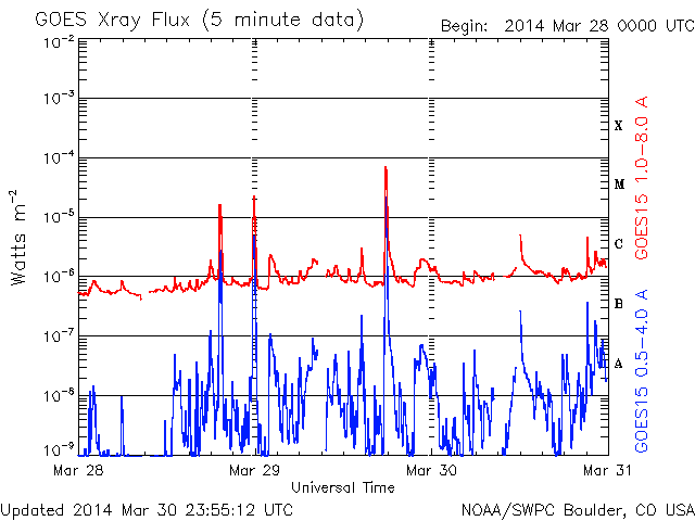 Die Daten in der obigen Grafik wurden geändert, um den Skalierungsfaktor des Space Weather Prediction Center (SWPC) zu entfernen. Durch den SWPC-Skalierungsfaktors für die Flare-Indizes werden die operativen Daten um 42 % kleiner angegeben als für die wissenschaftlichen Qualitätsdaten. Der Skalierungsfaktor wurde auch aus der Liste der Sonneneruptionen entfernt, um die tatsächlichen physikalischen Einheiten wiederzugeben.