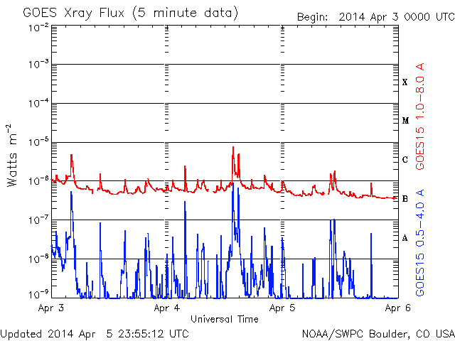 Die Daten in der obigen Grafik wurden geändert, um den Skalierungsfaktor des Space Weather Prediction Center (SWPC) zu entfernen. Durch den SWPC-Skalierungsfaktors für die Flare-Indizes werden die operativen Daten um 42 % kleiner angegeben als für die wissenschaftlichen Qualitätsdaten. Der Skalierungsfaktor wurde auch aus der Liste der Sonneneruptionen entfernt, um die tatsächlichen physikalischen Einheiten wiederzugeben.