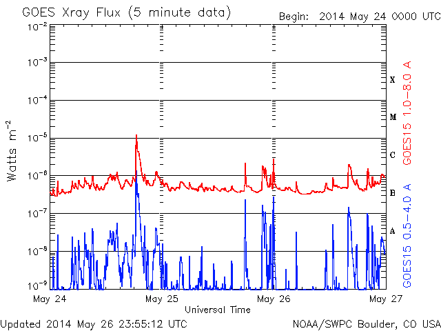 Die Daten in der obigen Grafik wurden geändert, um den Skalierungsfaktor des Space Weather Prediction Center (SWPC) zu entfernen. Durch den SWPC-Skalierungsfaktors für die Flare-Indizes werden die operativen Daten um 42 % kleiner angegeben als für die wissenschaftlichen Qualitätsdaten. Der Skalierungsfaktor wurde auch aus der Liste der Sonneneruptionen entfernt, um die tatsächlichen physikalischen Einheiten wiederzugeben.