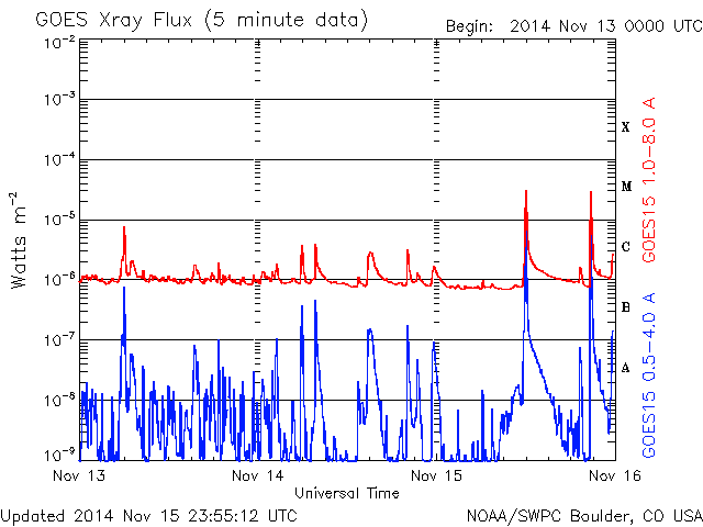 Die Daten in der obigen Grafik wurden geändert, um den Skalierungsfaktor des Space Weather Prediction Center (SWPC) zu entfernen. Durch den SWPC-Skalierungsfaktors für die Flare-Indizes werden die operativen Daten um 42 % kleiner angegeben als für die wissenschaftlichen Qualitätsdaten. Der Skalierungsfaktor wurde auch aus der Liste der Sonneneruptionen entfernt, um die tatsächlichen physikalischen Einheiten wiederzugeben.