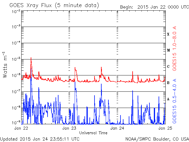 Die Daten in der obigen Grafik wurden geändert, um den Skalierungsfaktor des Space Weather Prediction Center (SWPC) zu entfernen. Durch den SWPC-Skalierungsfaktors für die Flare-Indizes werden die operativen Daten um 42 % kleiner angegeben als für die wissenschaftlichen Qualitätsdaten. Der Skalierungsfaktor wurde auch aus der Liste der Sonneneruptionen entfernt, um die tatsächlichen physikalischen Einheiten wiederzugeben.