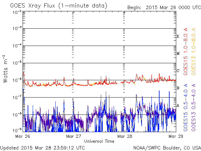 Die Daten in der obigen Grafik wurden geändert, um den Skalierungsfaktor des Space Weather Prediction Center (SWPC) zu entfernen. Durch den SWPC-Skalierungsfaktors für die Flare-Indizes werden die operativen Daten um 42 % kleiner angegeben als für die wissenschaftlichen Qualitätsdaten. Der Skalierungsfaktor wurde auch aus der Liste der Sonneneruptionen entfernt, um die tatsächlichen physikalischen Einheiten wiederzugeben.