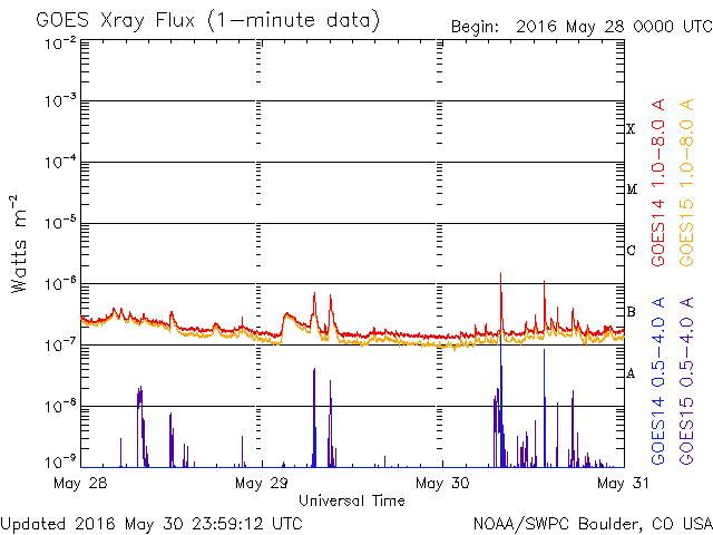 Die Daten in der obigen Grafik wurden geändert, um den Skalierungsfaktor des Space Weather Prediction Center (SWPC) zu entfernen. Durch den SWPC-Skalierungsfaktors für die Flare-Indizes werden die operativen Daten um 42 % kleiner angegeben als für die wissenschaftlichen Qualitätsdaten. Der Skalierungsfaktor wurde auch aus der Liste der Sonneneruptionen entfernt, um die tatsächlichen physikalischen Einheiten wiederzugeben.