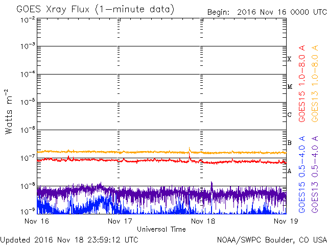 Die Daten in der obigen Grafik wurden geändert, um den Skalierungsfaktor des Space Weather Prediction Center (SWPC) zu entfernen. Durch den SWPC-Skalierungsfaktors für die Flare-Indizes werden die operativen Daten um 42 % kleiner angegeben als für die wissenschaftlichen Qualitätsdaten. Der Skalierungsfaktor wurde auch aus der Liste der Sonneneruptionen entfernt, um die tatsächlichen physikalischen Einheiten wiederzugeben.