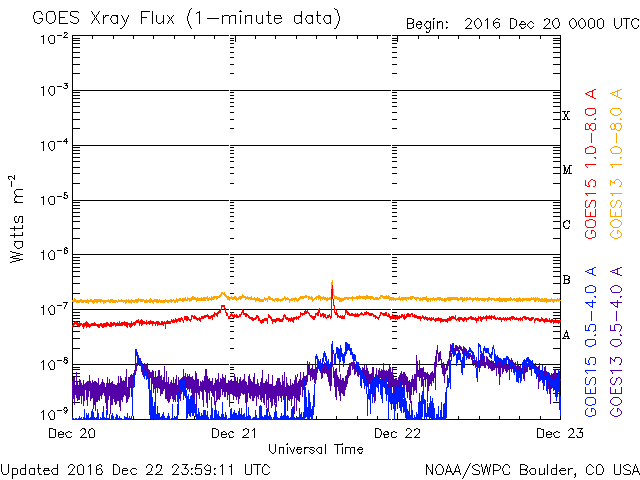 Die Daten in der obigen Grafik wurden geändert, um den Skalierungsfaktor des Space Weather Prediction Center (SWPC) zu entfernen. Durch den SWPC-Skalierungsfaktors für die Flare-Indizes werden die operativen Daten um 42 % kleiner angegeben als für die wissenschaftlichen Qualitätsdaten. Der Skalierungsfaktor wurde auch aus der Liste der Sonneneruptionen entfernt, um die tatsächlichen physikalischen Einheiten wiederzugeben.