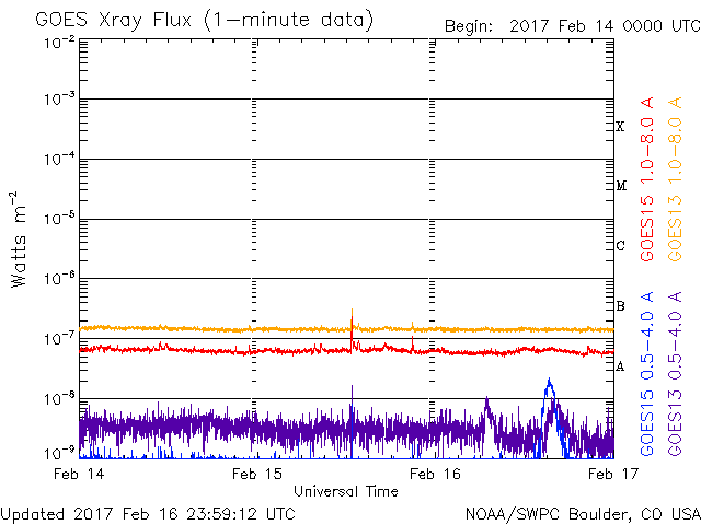 Die Daten in der obigen Grafik wurden geändert, um den Skalierungsfaktor des Space Weather Prediction Center (SWPC) zu entfernen. Durch den SWPC-Skalierungsfaktors für die Flare-Indizes werden die operativen Daten um 42 % kleiner angegeben als für die wissenschaftlichen Qualitätsdaten. Der Skalierungsfaktor wurde auch aus der Liste der Sonneneruptionen entfernt, um die tatsächlichen physikalischen Einheiten wiederzugeben.
