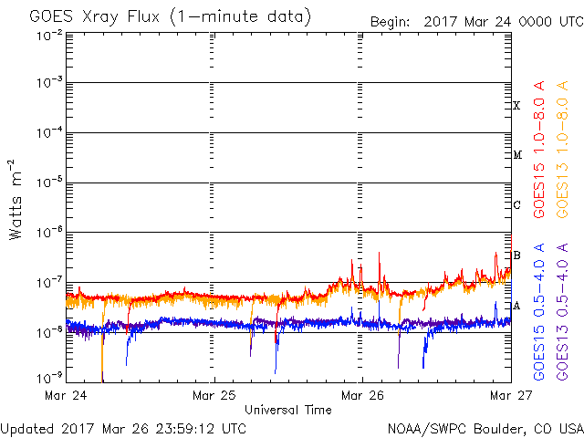 Die Daten in der obigen Grafik wurden geändert, um den Skalierungsfaktor des Space Weather Prediction Center (SWPC) zu entfernen. Durch den SWPC-Skalierungsfaktors für die Flare-Indizes werden die operativen Daten um 42 % kleiner angegeben als für die wissenschaftlichen Qualitätsdaten. Der Skalierungsfaktor wurde auch aus der Liste der Sonneneruptionen entfernt, um die tatsächlichen physikalischen Einheiten wiederzugeben.