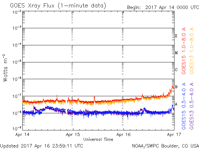 Die Daten in der obigen Grafik wurden geändert, um den Skalierungsfaktor des Space Weather Prediction Center (SWPC) zu entfernen. Durch den SWPC-Skalierungsfaktors für die Flare-Indizes werden die operativen Daten um 42 % kleiner angegeben als für die wissenschaftlichen Qualitätsdaten. Der Skalierungsfaktor wurde auch aus der Liste der Sonneneruptionen entfernt, um die tatsächlichen physikalischen Einheiten wiederzugeben.