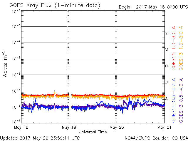 Die Daten in der obigen Grafik wurden geändert, um den Skalierungsfaktor des Space Weather Prediction Center (SWPC) zu entfernen. Durch den SWPC-Skalierungsfaktors für die Flare-Indizes werden die operativen Daten um 42 % kleiner angegeben als für die wissenschaftlichen Qualitätsdaten. Der Skalierungsfaktor wurde auch aus der Liste der Sonneneruptionen entfernt, um die tatsächlichen physikalischen Einheiten wiederzugeben.