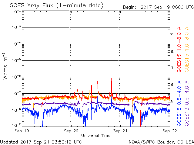 Die Daten in der obigen Grafik wurden geändert, um den Skalierungsfaktor des Space Weather Prediction Center (SWPC) zu entfernen. Durch den SWPC-Skalierungsfaktors für die Flare-Indizes werden die operativen Daten um 42 % kleiner angegeben als für die wissenschaftlichen Qualitätsdaten. Der Skalierungsfaktor wurde auch aus der Liste der Sonneneruptionen entfernt, um die tatsächlichen physikalischen Einheiten wiederzugeben.
