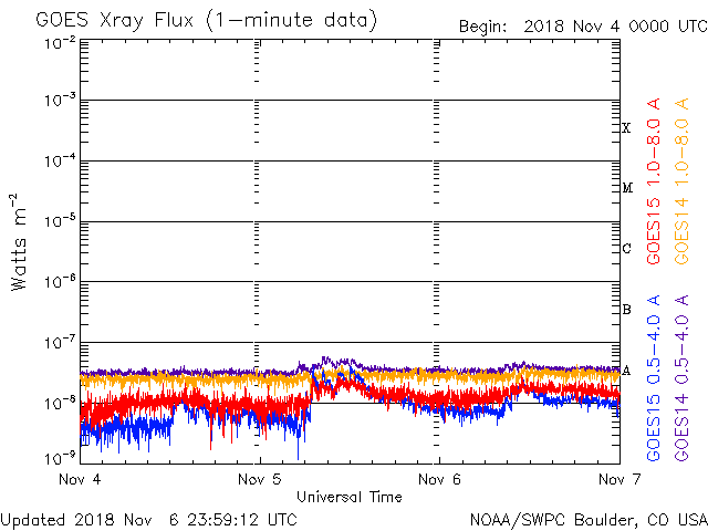 Die Daten in der obigen Grafik wurden geändert, um den Skalierungsfaktor des Space Weather Prediction Center (SWPC) zu entfernen. Durch den SWPC-Skalierungsfaktors für die Flare-Indizes werden die operativen Daten um 42 % kleiner angegeben als für die wissenschaftlichen Qualitätsdaten. Der Skalierungsfaktor wurde auch aus der Liste der Sonneneruptionen entfernt, um die tatsächlichen physikalischen Einheiten wiederzugeben.