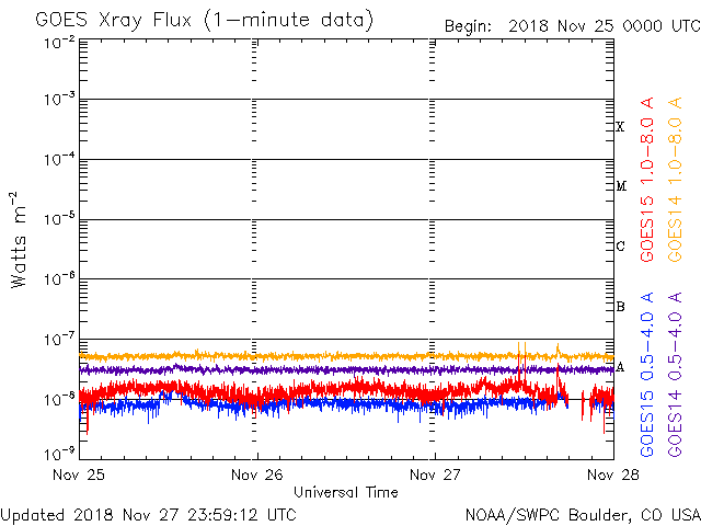 Die Daten in der obigen Grafik wurden geändert, um den Skalierungsfaktor des Space Weather Prediction Center (SWPC) zu entfernen. Durch den SWPC-Skalierungsfaktors für die Flare-Indizes werden die operativen Daten um 42 % kleiner angegeben als für die wissenschaftlichen Qualitätsdaten. Der Skalierungsfaktor wurde auch aus der Liste der Sonneneruptionen entfernt, um die tatsächlichen physikalischen Einheiten wiederzugeben.