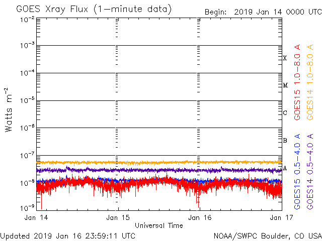 Die Daten in der obigen Grafik wurden geändert, um den Skalierungsfaktor des Space Weather Prediction Center (SWPC) zu entfernen. Durch den SWPC-Skalierungsfaktors für die Flare-Indizes werden die operativen Daten um 42 % kleiner angegeben als für die wissenschaftlichen Qualitätsdaten. Der Skalierungsfaktor wurde auch aus der Liste der Sonneneruptionen entfernt, um die tatsächlichen physikalischen Einheiten wiederzugeben.
