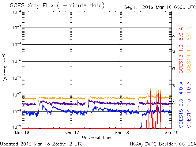 Die Daten in der obigen Grafik wurden geändert, um den Skalierungsfaktor des Space Weather Prediction Center (SWPC) zu entfernen. Durch den SWPC-Skalierungsfaktors für die Flare-Indizes werden die operativen Daten um 42 % kleiner angegeben als für die wissenschaftlichen Qualitätsdaten. Der Skalierungsfaktor wurde auch aus der Liste der Sonneneruptionen entfernt, um die tatsächlichen physikalischen Einheiten wiederzugeben.