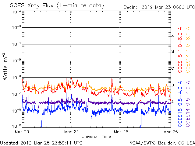 Die Daten in der obigen Grafik wurden geändert, um den Skalierungsfaktor des Space Weather Prediction Center (SWPC) zu entfernen. Durch den SWPC-Skalierungsfaktors für die Flare-Indizes werden die operativen Daten um 42 % kleiner angegeben als für die wissenschaftlichen Qualitätsdaten. Der Skalierungsfaktor wurde auch aus der Liste der Sonneneruptionen entfernt, um die tatsächlichen physikalischen Einheiten wiederzugeben.