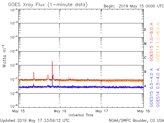 Die Daten in der obigen Grafik wurden geändert, um den Skalierungsfaktor des Space Weather Prediction Center (SWPC) zu entfernen. Durch den SWPC-Skalierungsfaktors für die Flare-Indizes werden die operativen Daten um 42 % kleiner angegeben als für die wissenschaftlichen Qualitätsdaten. Der Skalierungsfaktor wurde auch aus der Liste der Sonneneruptionen entfernt, um die tatsächlichen physikalischen Einheiten wiederzugeben.