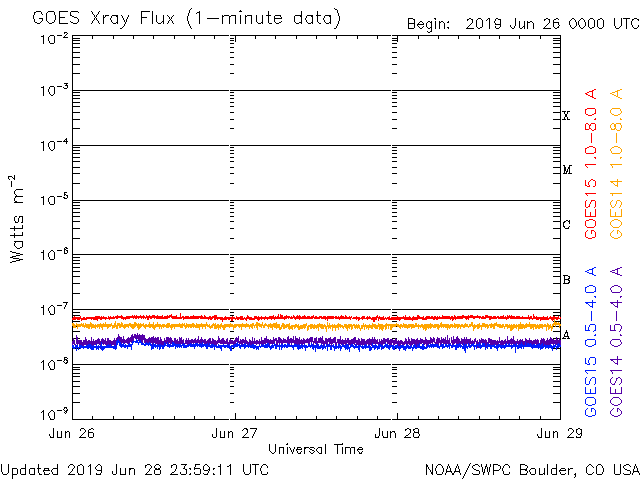 Die Daten in der obigen Grafik wurden geändert, um den Skalierungsfaktor des Space Weather Prediction Center (SWPC) zu entfernen. Durch den SWPC-Skalierungsfaktors für die Flare-Indizes werden die operativen Daten um 42 % kleiner angegeben als für die wissenschaftlichen Qualitätsdaten. Der Skalierungsfaktor wurde auch aus der Liste der Sonneneruptionen entfernt, um die tatsächlichen physikalischen Einheiten wiederzugeben.