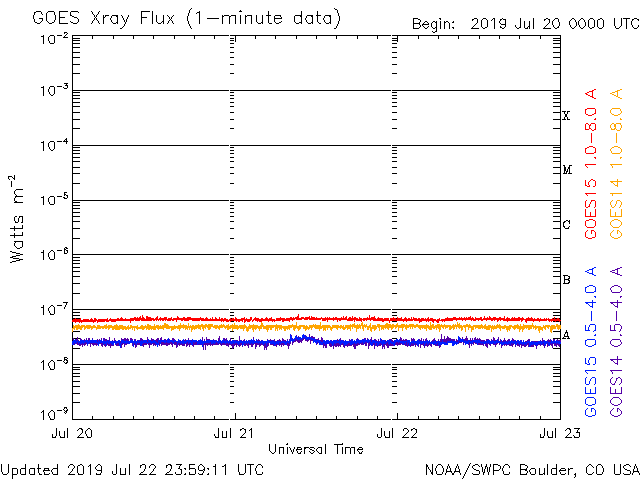 Die Daten in der obigen Grafik wurden geändert, um den Skalierungsfaktor des Space Weather Prediction Center (SWPC) zu entfernen. Durch den SWPC-Skalierungsfaktors für die Flare-Indizes werden die operativen Daten um 42 % kleiner angegeben als für die wissenschaftlichen Qualitätsdaten. Der Skalierungsfaktor wurde auch aus der Liste der Sonneneruptionen entfernt, um die tatsächlichen physikalischen Einheiten wiederzugeben.