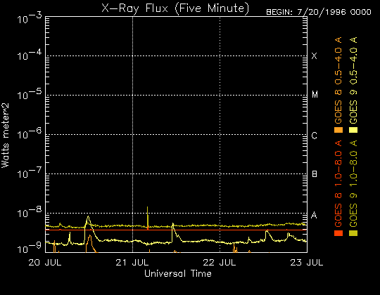 The operational data in the graph above has been modified to remove the scaling factor that has been applied by the Space Weather Prediction Center (SWPC). Because of the SWPC scaling factor in the operational data, flare indices for the operational data were reported as 42% smaller than for the science quality data. The scaling factor has also been removed from the solar flare list to reflect the true physical units.