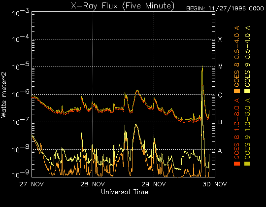 The operational data in the graph above has been modified to remove the scaling factor that has been applied by the Space Weather Prediction Center (SWPC). Because of the SWPC scaling factor in the operational data, flare indices for the operational data were reported as 42% smaller than for the science quality data. The scaling factor has also been removed from the solar flare list to reflect the true physical units.