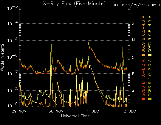 The operational data in the graph above has been modified to remove the scaling factor that has been applied by the Space Weather Prediction Center (SWPC). Because of the SWPC scaling factor in the operational data, flare indices for the operational data were reported as 42% smaller than for the science quality data. The scaling factor has also been removed from the solar flare list to reflect the true physical units.