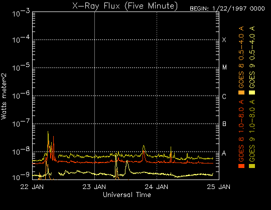 The operational data in the graph above has been modified to remove the scaling factor that has been applied by the Space Weather Prediction Center (SWPC). Because of the SWPC scaling factor in the operational data, flare indices for the operational data were reported as 42% smaller than for the science quality data. The scaling factor has also been removed from the solar flare list to reflect the true physical units.