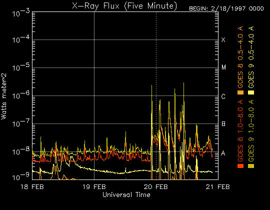The operational data in the graph above has been modified to remove the scaling factor that has been applied by the Space Weather Prediction Center (SWPC). Because of the SWPC scaling factor in the operational data, flare indices for the operational data were reported as 42% smaller than for the science quality data. The scaling factor has also been removed from the solar flare list to reflect the true physical units.