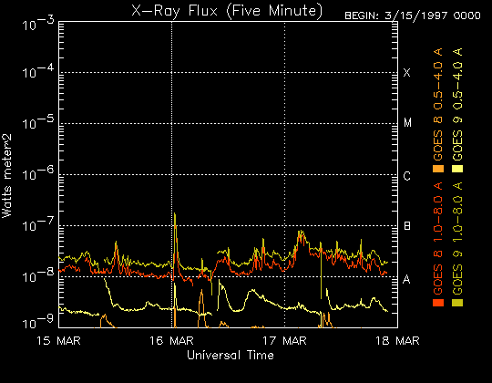 The operational data in the graph above has been modified to remove the scaling factor that has been applied by the Space Weather Prediction Center (SWPC). Because of the SWPC scaling factor in the operational data, flare indices for the operational data were reported as 42% smaller than for the science quality data. The scaling factor has also been removed from the solar flare list to reflect the true physical units.