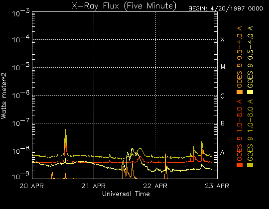 The operational data in the graph above has been modified to remove the scaling factor that has been applied by the Space Weather Prediction Center (SWPC). Because of the SWPC scaling factor in the operational data, flare indices for the operational data were reported as 42% smaller than for the science quality data. The scaling factor has also been removed from the solar flare list to reflect the true physical units.