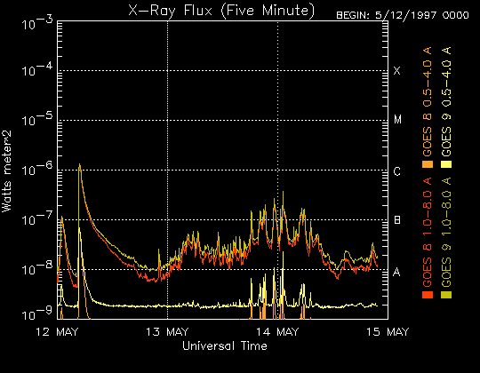 The operational data in the graph above has been modified to remove the scaling factor that has been applied by the Space Weather Prediction Center (SWPC). Because of the SWPC scaling factor in the operational data, flare indices for the operational data were reported as 42% smaller than for the science quality data. The scaling factor has also been removed from the solar flare list to reflect the true physical units.