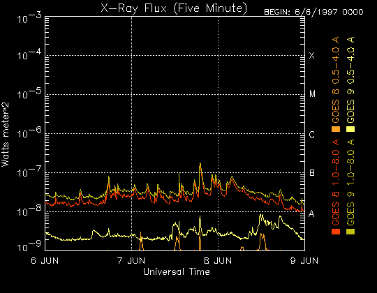 The operational data in the graph above has been modified to remove the scaling factor that has been applied by the Space Weather Prediction Center (SWPC). Because of the SWPC scaling factor in the operational data, flare indices for the operational data were reported as 42% smaller than for the science quality data. The scaling factor has also been removed from the solar flare list to reflect the true physical units.