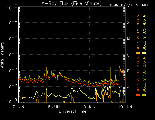The operational data in the graph above has been modified to remove the scaling factor that has been applied by the Space Weather Prediction Center (SWPC). Because of the SWPC scaling factor in the operational data, flare indices for the operational data were reported as 42% smaller than for the science quality data. The scaling factor has also been removed from the solar flare list to reflect the true physical units.
