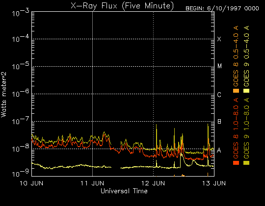 The operational data in the graph above has been modified to remove the scaling factor that has been applied by the Space Weather Prediction Center (SWPC). Because of the SWPC scaling factor in the operational data, flare indices for the operational data were reported as 42% smaller than for the science quality data. The scaling factor has also been removed from the solar flare list to reflect the true physical units.