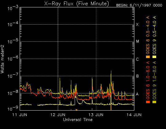The operational data in the graph above has been modified to remove the scaling factor that has been applied by the Space Weather Prediction Center (SWPC). Because of the SWPC scaling factor in the operational data, flare indices for the operational data were reported as 42% smaller than for the science quality data. The scaling factor has also been removed from the solar flare list to reflect the true physical units.